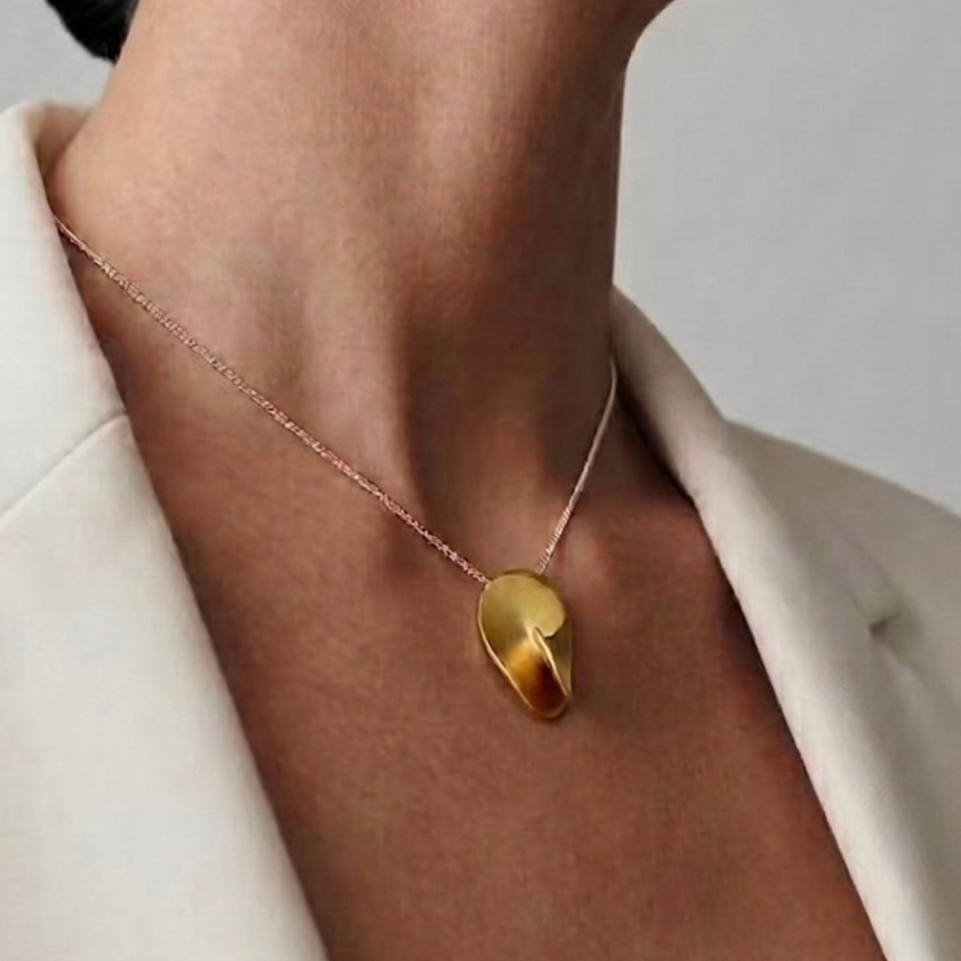 El Áurea Colgante recoge la esencia de la colección en una forma que descansa con suavidad sobre el cuerpo.